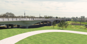 The bridge will carry two lanes in each direction to accommodate the increased traffic demands. It will also include a raised sidewalk on the east side and a separated bicycle/pedestrian walkway on the west side.